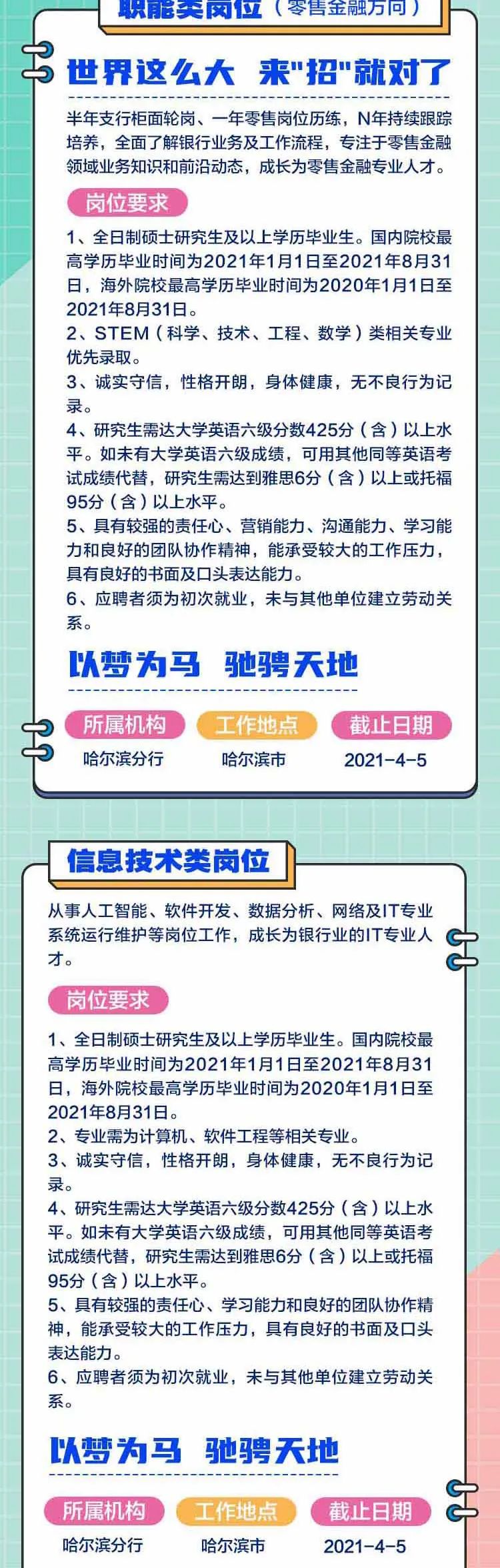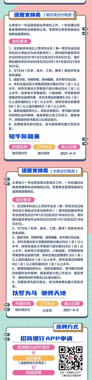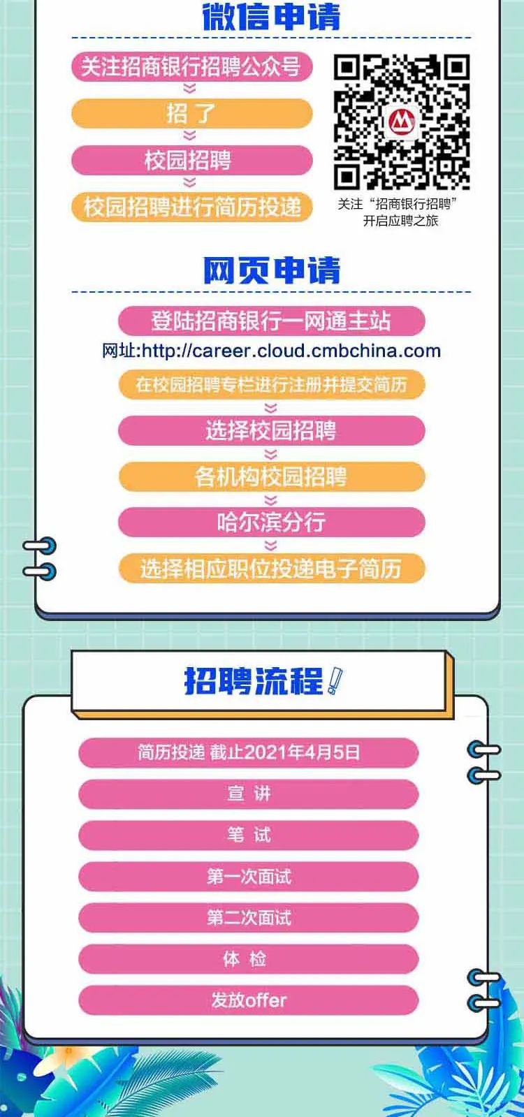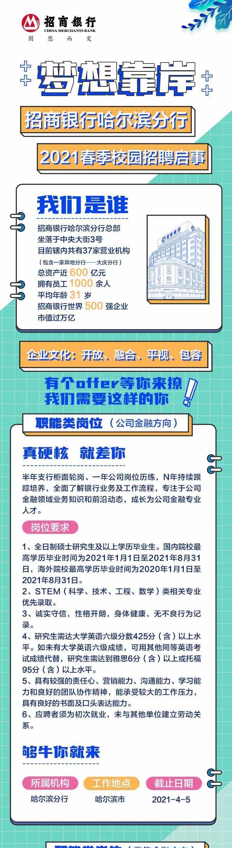 【本、研】哈尔滨|招商银行哈尔滨分行2021春季校园招聘