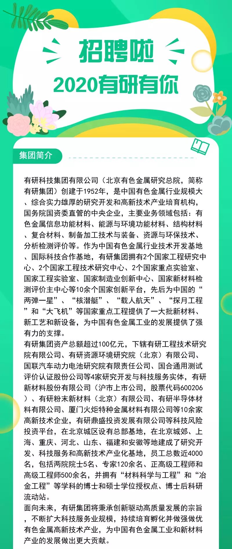 【校招】招80人,有研集团校招启动!2020有研有你!