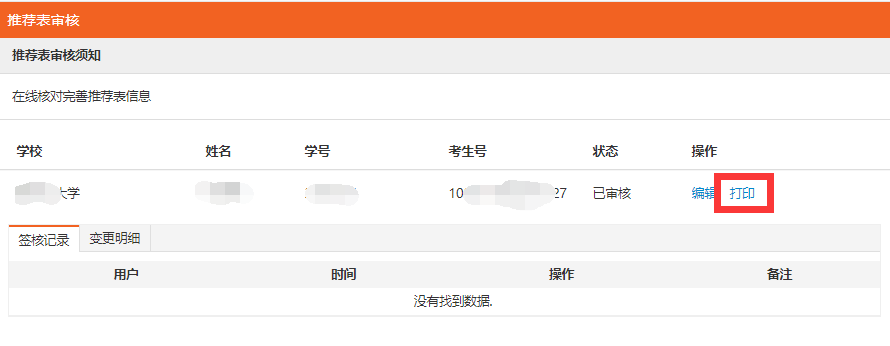 经学校审核通过后,可在推荐表申请页面点击【打印】按钮,在新页面浏览推荐表信息并打印,如下图所示: