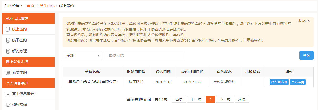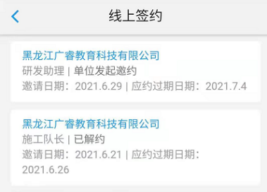 点击【线上签约】,查看单位发送的签约邀请,如下图所示: