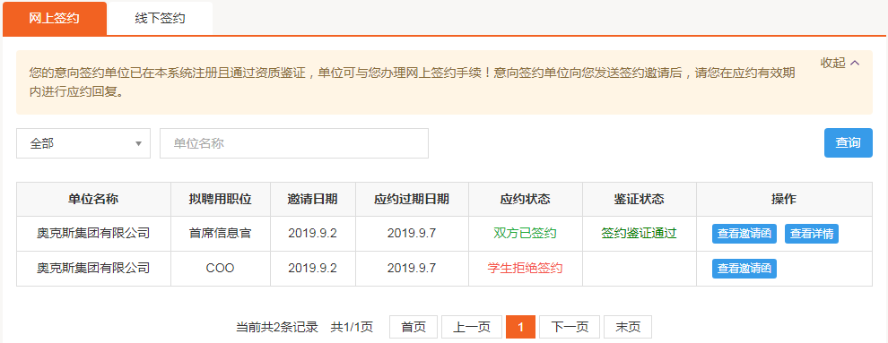 (1)学生能且只能与唯一一家用人单位签约,一旦签约后,其他邀请函只能查看,无法操作。