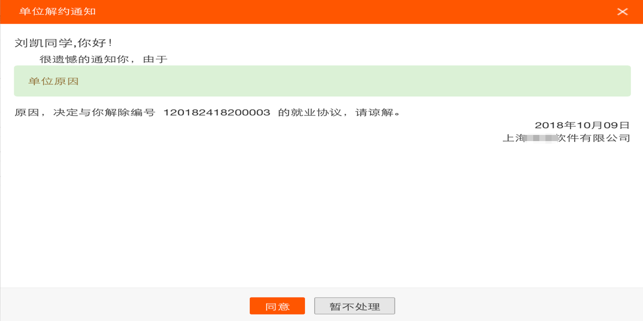 学生在充分了解到用人单位的解约理由,并确认同意解约须知后,即可点击解约【同意】按钮,即达成解约意向,等待学校老师审核,如下图所示: