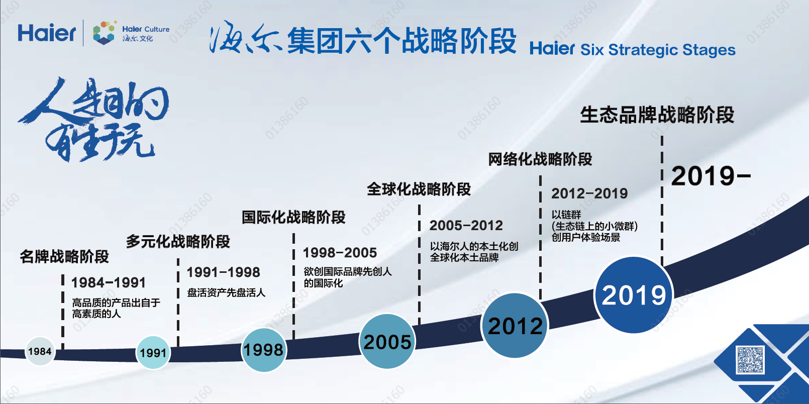 从1984年创业至今,海尔集团经历了名牌战略发展阶段、多元化战略发展阶段、国际化战略发展阶段、全球化品牌战略发展阶段、网络化战略发展阶段五个阶段,2019年12月,进入第六个战略发展阶段,目标是创引领的物联网生态品牌。创业以来,海尔致力于成为“时代的企业”,每个阶段的战略主题都是随着时代变化而不断变化的,重点关注的就是人的价值实现,使员工在为用户创造价值的同时实现自身的价值。