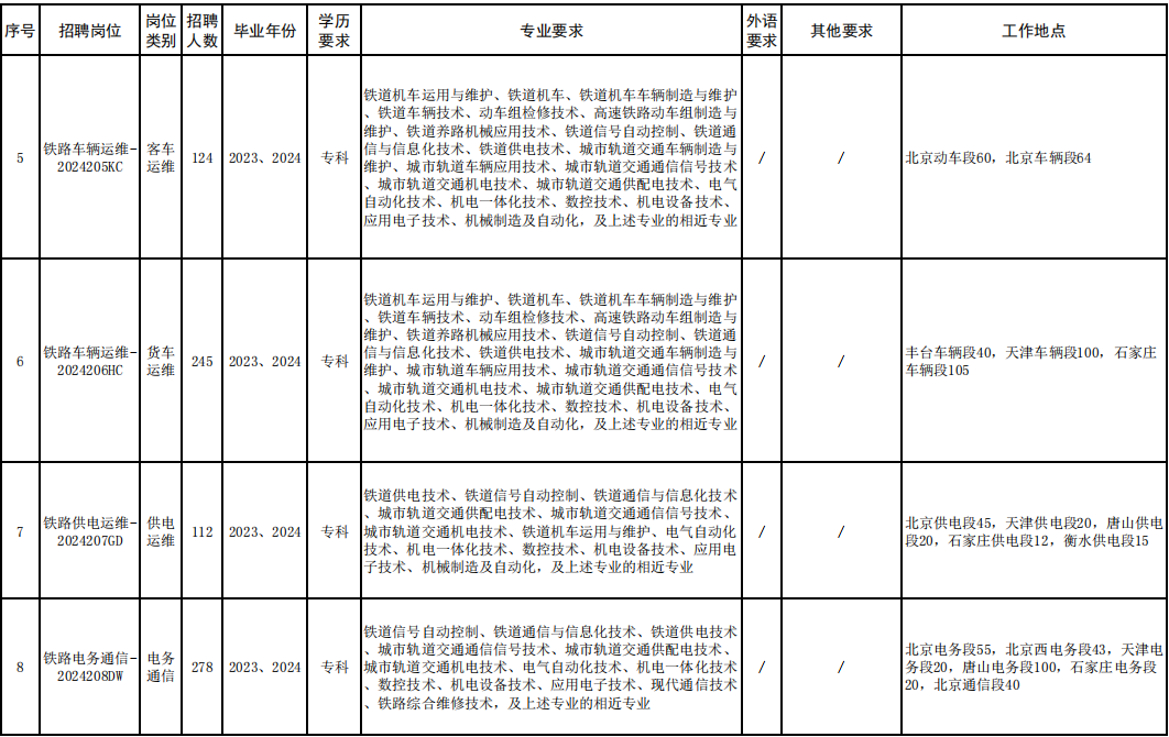 中国铁路北京局集团有限公司根据企业发展需要,招聘普通高校大专(高职)学历毕业生。具体事宜公告如下.