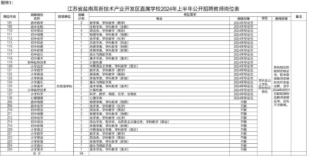招聘全额拨款事业编制教师54名,具体招聘岗位及招聘条件等详见《江苏省盐南高新技术产业开发区直属学校2024年上半年公开招聘教师岗位表》(附件1)。