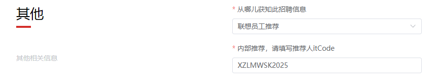 【内推通道】在“联想校招官网”投递校招职位,创建简历时“从哪儿获知招聘信息”选择“联想员工推荐”并且输入推荐人ITcode:XZLMWSK2025