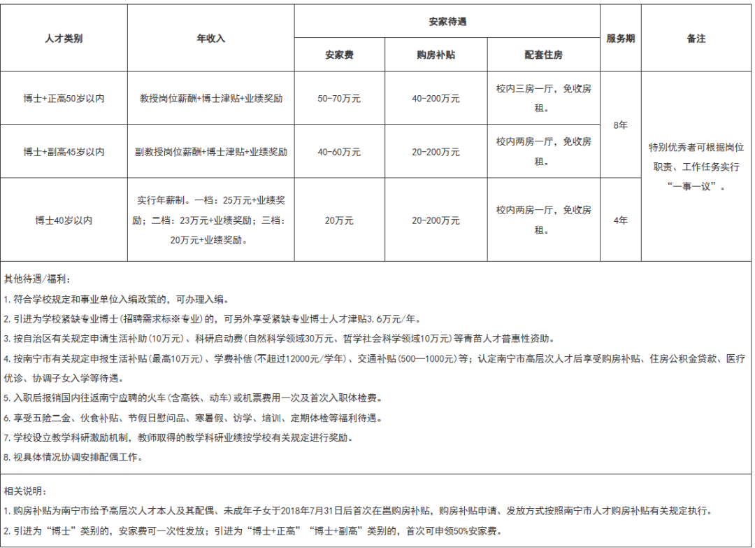 01. 学校简介 南宁学院是南宁市人民政府与民革广西区委合作共办的本科高校,为国家首批应用技术大学试点高校、广西新建本科学校转型发展试点学校、自治区首批深化创新创业教育改革示范高校、广西立项建设硕士学位授予单位。学校坐落在全国文明城市、国家生态园林城市、“中国绿城”——广西首府南宁市。学校现设有二级学院12个,开办本科专业40个,覆盖工学、管理学、艺术学、经济学、教育学等5个学科门类,全日制在校生两万多人,现有教职工一千余人。 2021年《南宁市国民经济和社会发展第十四个五年规划和2035年远景目标纲要》明确指出:“高水平办好南宁学院,对标推进南宁学院创建为南宁大学。”当前,学校抢抓发展机遇,贯彻“应用型、开放式、新体验”的办学理念,以“质量发展、特色发展、创新发展”为主题,上下一心、凝心聚力投入加强内涵建设各项工作,力争早日实现升格南宁大学目标。 02. 招聘对象及招聘计划 (一)招聘对象 符合招聘(录用)条件和招聘岗位具体资格条件的普通高校2025年应届毕业生及社会在职、非在职人员均可报名应聘。 (二)招聘计划 本次公开招聘博士不少于150名,具体岗位要求详见附件。 03. 招聘(录用)条件 (一)基本条件 1.具有中华人民共和国国籍; 2.拥护中华人民共和国宪法,拥护中国共产党的领导,具备良好的思想政治素质,遵纪守法; 3.践行社会主义核心价值观,遵守教师职业道德规范; 4.有强烈的事业心、责任感和敬业精神,善于团结协作,愿为学校发展、学科专业建设和人才培养做贡献; 5.具有履行岗位职责所需的知识、能力和素质,并符合招聘岗位规定的专业、学历、学位、职称及工作经历等条件; 6.具有与岗位相适应的身体条件,心理素质良好; 7.遵守劳动纪律和规章制度,服从单位管理和工作安排; 8.诚实守信,个人档案与材料无虚假情况、无隐瞒信息; 9.无劳资纠纷和不良从业记录,无违反国家法律、法规的其他情形; 10.具备岗位所需的其他条件。 (二)其他条件 学校分三个类别引进博士: 1.博士+正高 年龄在50周岁以下,具有博士学位的正高级职称人才,且在近5年有相应的教学科研业绩成果。 2.博士+副高 年龄45周岁以下,具有博士学位的副高级及以上职称人才,且在近5年有相应的教学科研业绩成果。 3.博士 年龄在40周岁以下,具有博士学位的人才,且在近5年有相应的教学科研业绩成果。 (三)有下列情形之一的不接受报名应聘 1.现役军人; 2.曾因犯罪受过刑事处罚的人员和曾被开除公职的人员; 3.在各级公务员或事业单位招考中被认定有舞弊等严重违反录用或招聘纪律行为的人员; 4.报考人员不得报考聘用后即构成回避关系的招聘岗位; 5.正在被依法列为失信联合惩戒对象的人员; 6.在公务员招考中违规违纪尚在禁考期内的人员; 7.按规定不得招聘为事业单位工作人员的其他情形的人员。 04. 招聘程序 (一)报名方式及要求 1.报名时间 从公告发布之日起至2025年9月30日。 2.报名方法 采用网络报名,应聘人员登录南宁学院人才招聘网站(http://hr.nnxy.cn/recruit),按要求进行注册、报名。通过“我的简历”填写个人基本信息,上传电子佐证材料;通过“招聘职位”查看并选择需应聘的岗位,发起岗位申请。 3.报名注意事项 (1)每位应聘者只可申请一个岗位。 (2)应聘者须按照要求提交报名材料,不按照要求提交者将视为无效报名,资格审查不予通过。网上报名审查结果不作为确定符合岗位条件的最终依据,资格审查贯穿招聘工作全过程。 (3)报考人员须按岗位要求学历对应毕业证书上的专业如实填写,专业、学历、学位相统一。境外留学毕业生须取得教育部留学服务中心认证书。 (4)报考人员所填写的报名信息资料必须真实、准确,在职在编人员应如实填写在职工作情况。因网上报名提交的材料不真实、不完整或错误填写报名信息,造成网上资格审查及后续资格审查、考察不通过等后果的,由报考人员自行承担责任。 (二)资格审查 用人单位根据应聘人员提供的报名材料,审查应聘人员的年龄、专业、学历、学位、职称及工作经历等是否符合岗位招聘条件要求。学校人事处进行复审。资格审查贯穿招聘工作全过程,如发现应聘者的信息不符合招聘资格条件要求的即取消其应聘资格。 招聘岗位关于年龄、相关经历等时间的计算,均截至2025年9月30日(报名截止日期)。 招聘岗位要求的学历、专业等资格条件方面的问题,由学校人事处负责解释。 (三)面试及考察 面试可采取试讲、面谈等不同形式,具体面试形式由用人单位确定。面试实行100分制评分,70分为合格。根据面试成绩从高分到低分,从面试合格人员中按照招聘1:1的比例确定考察对象。考察内容主要包括应聘者的政治思想、道德品质、能力素质、学习和工作表现、岗位匹配度等方面的情况。凡是因重要档案材料不全、个人经历不明、历史状况不清等无法进行有效考察的,达不到招聘岗位条件的,不得确定为拟聘人选。 (四)体检 根据考察结果,经学校研究择优确定体检人选。体检人员由南宁学院组织到指定医院进行体检。体检标准参照广西壮族自治区事业单位公开招聘体检标准。体检不合格的不能确定为拟聘人员。 (五)聘用 按学校规定办理聘用手续。 05. 人才待遇 (一)薪酬福利 各类别人才可享受相应人才待遇。 (二)成长发展 学校以利用硕士点建设契机