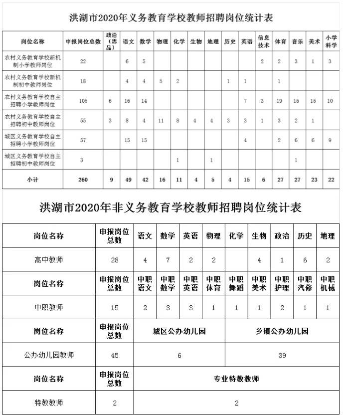 2020年,洪湖市根据教育发展需要,将公开招聘各类教师350名。其中:义务教育学校教师260名(农村学校200名、城区学校60名),非义务教育学校教师90名(高中28名、中职15名、公办幼儿园45名、特校2名)。
