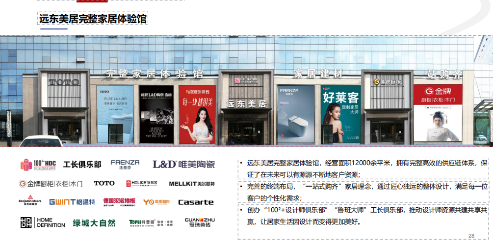 主营产品:瓷砖(冠珠、L&D)、卫浴(TOTO、法恩莎)、全屋定制(金牌、好莱客、HD高定)、涂料(本杰明)、家电(卡萨帝)、壁纸窗帘(特普丽)、吊顶(美尔凯特)、门窗(格温特)、地板(汉诺)。