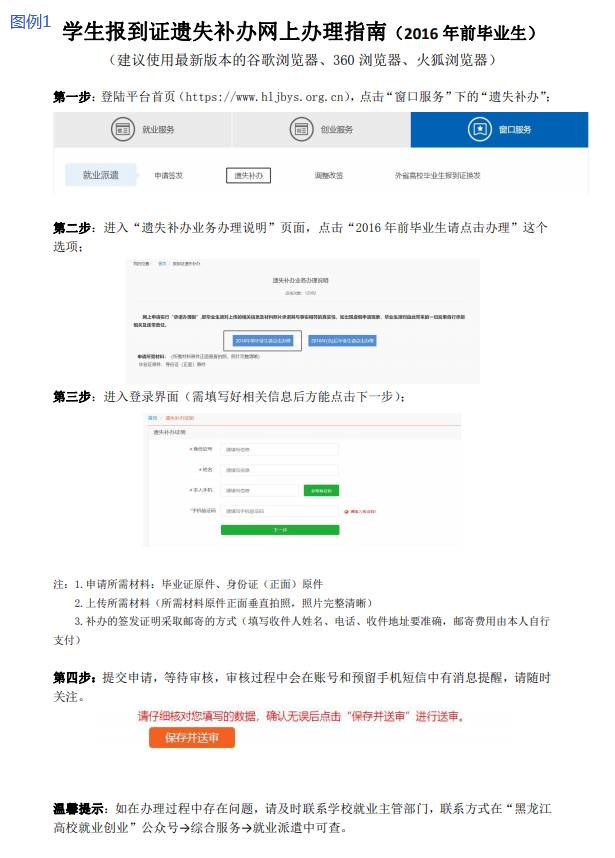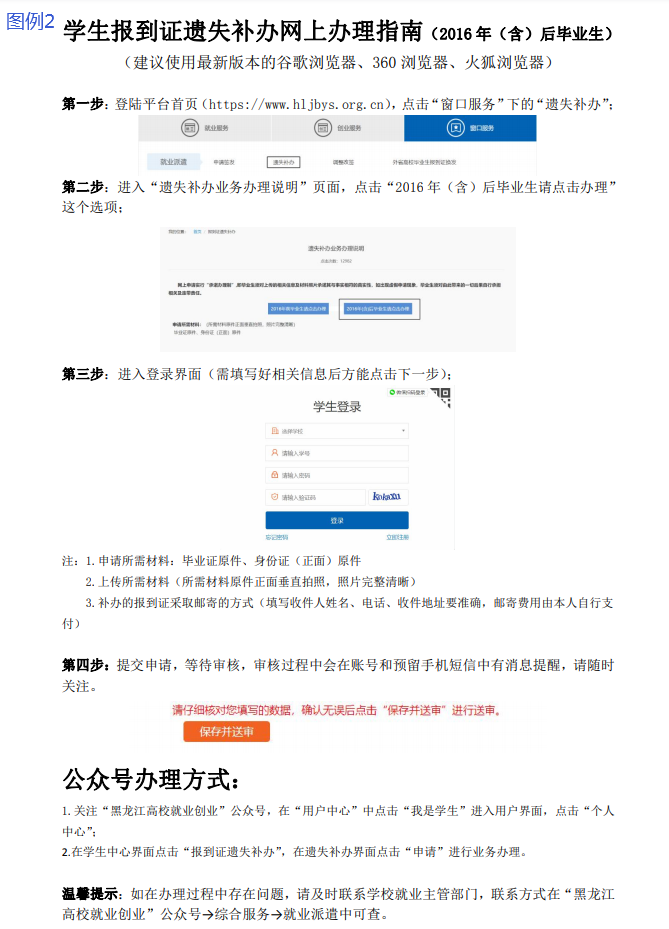 2020年开始,黑龙江省毕业生报到证遗失补办工作取消窗口办理,学生通过登录黑龙江省大学生就业创业服务平台网上办理,补办分两种情况: